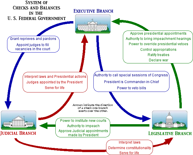 The government is organized around three separate branches. Though the constitution says that these three powers must be separated they are still connected and are not completely independent of each other. What ties them together is known as checks and balances. This means that each branch is subject to a number of constitutional restraints or checks by the other branches. This means that each branch has certain powers with which it can check the operations of the other two. Congress has the power to make laws but the president may veto any act of congress but Congress can also override a presidential veto by two-thirds vote in each house. Checks and balances gives power to each branch to override the other and make sure they are in line.