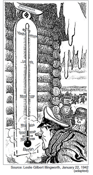 This World War II cartoon is showing the relationship between climate and the