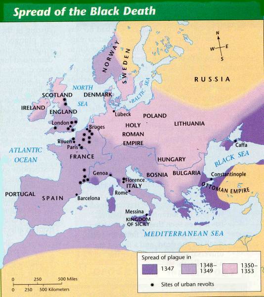 A result of the increased interaction between Europe and the Middle East was the spread of the Bubonic Plague, also known as, the Black Death. Starting in the 1100s, the plague was spread along trade routes and had an enormous impact on Europe, including the loss of 1/3 of the population, a decline in their economy, and a weakening of feudalism. In China, 35 million people died as a result of the plague, and in Cairo, Egypt, 7,000 people a day died at the disease's height.