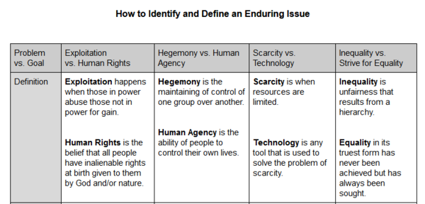 An enduring issue is one that many individuals or groups have attempted to address with varying degrees of success. In the essay, identify and define an enduring issue raised by this set of documents. Lastly,by using evidence from the documents, argue why the issue selected is significant and how it has endured across time. The Enduring Issue Guide and Writing Workshop below will assist students in writing the Enduring Issue Essay. | |