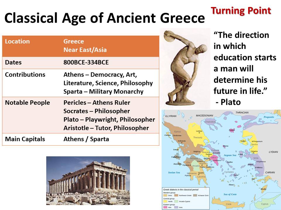 Greece becomes the intellectual home of math and science, poets, writers, playwrights, philosophers, architects, sculptors, and inventors led by Athens. Democracy develops in Athens under Pericles who rebuilds the city after it is destroyed by the Spartans and Persians. Ancient Rome will build their civilization on Greek ideas, and the Renaissance will revive Greek and Roman culture after the Middle Ages.