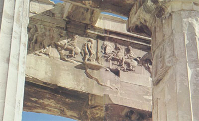 Perhaps the most famous Greek temple is the Parthenon. The Athenians began building this temple to Athena in 447 BCE and did not complete it until 15 years later. Like all Greek city-states, the Athenians built their most impressive temples atop the highest point in town, called the acropolis (literally 'high city'). The Parthenon had all the elements of a Greek temple: the columns and entablature, the pediment full of sculptures. It even had the extra features: metopes depicting a battle between Centaurs and Lapiths, the second row of columns with their accompanying frieze depicting a civic procession of Athenians in exquisite detail, and, within, the naos, recreated here by the fine folks at Nashville's Centennial Park: big idol of Athena, delicate Ionic columns on the inside.